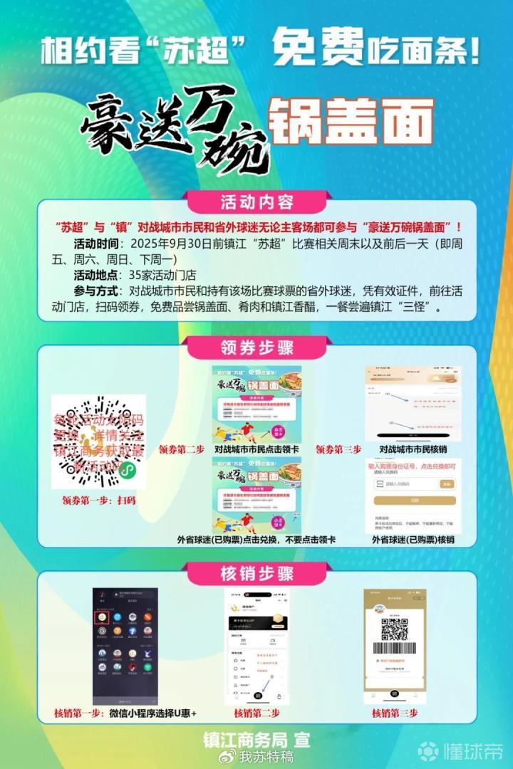 现在,福利加码,“苏超”中与镇江对战城市市民和省外球迷(没错,不管主场客场),均可参与免费吃面活动!