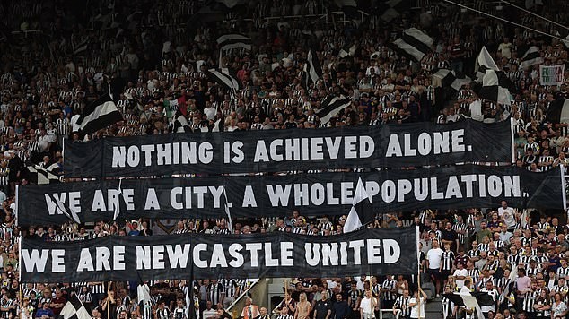 比赛开始前,纽卡球迷打出横幅,横幅上写道:“单凭一己之力干不成任何事。我们是一座城市,一个完整的群体。我们是纽卡斯尔联。”