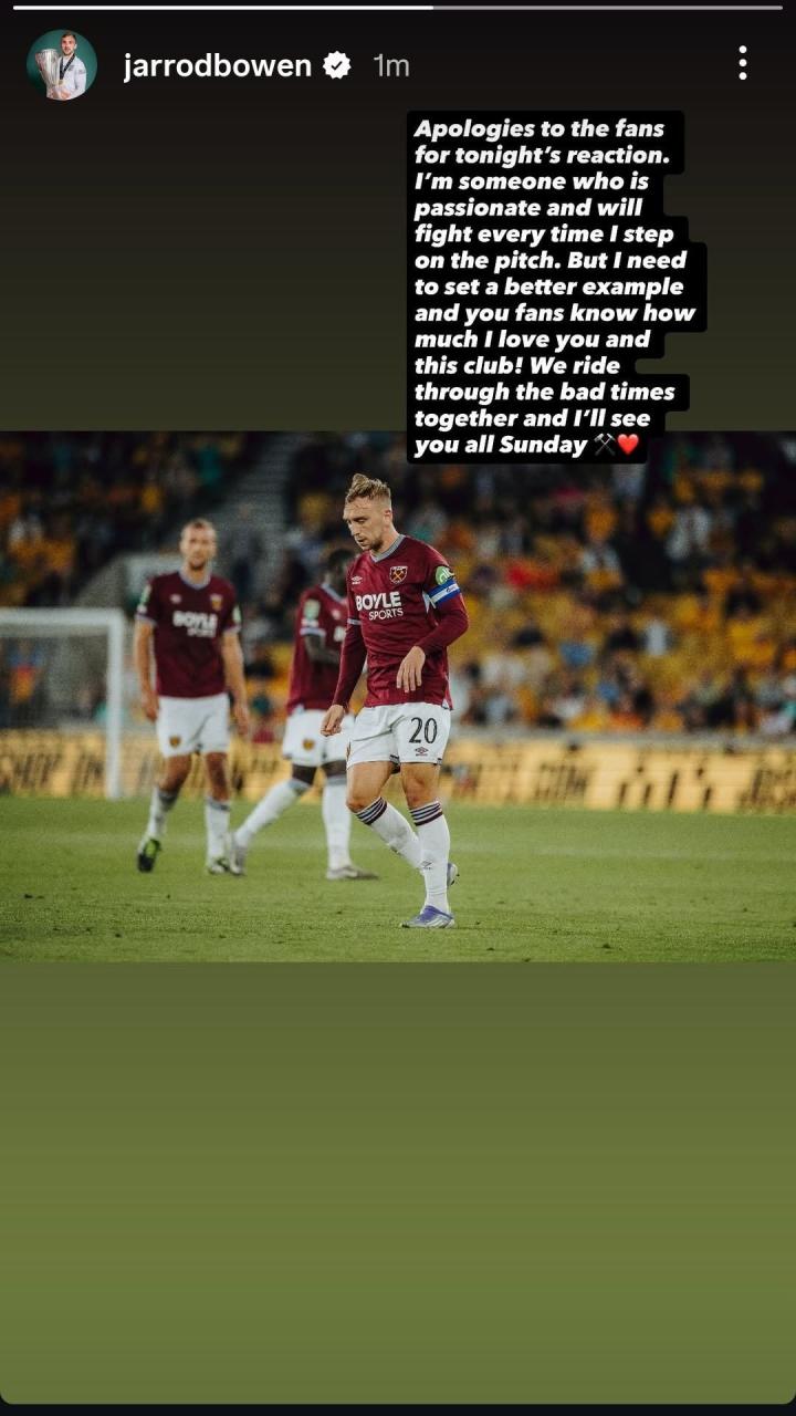 鲍恩写道:“向球迷为今晚的反应致歉。我是一个充满激情的人,每次踏上球场都会拼尽全力。但我需要以更好的方式树立榜样。你们知道我有多爱你们和这家俱乐部!无论顺境逆境,我们都会一起度过,周日见!”