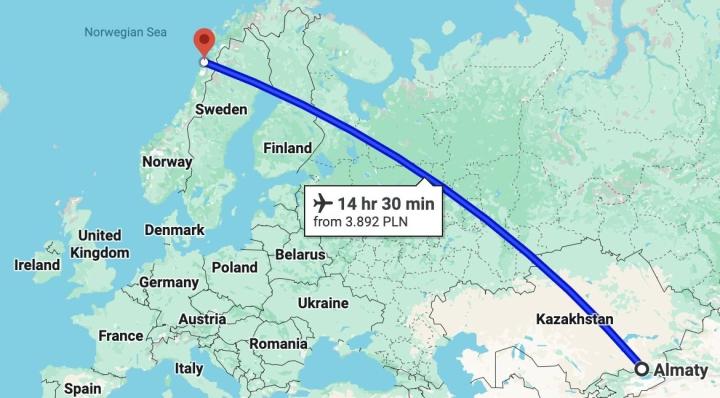 据地图数据显示,从博德飞往阿拉木图的直线距离为6148.8公里,单程飞行时间接近14小时30分。