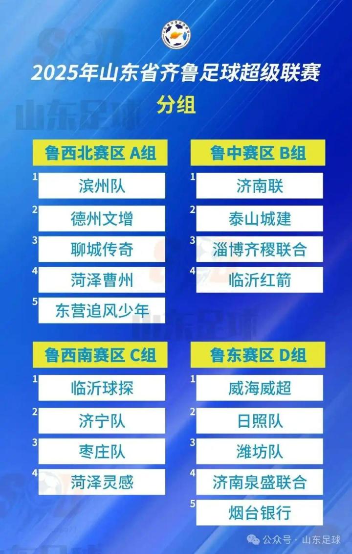 据山东足球公众号消息,8月24日,2025年山东省齐鲁足球超级联赛抽签仪式结束,18支队伍将分成4个赛区,进行第一阶段单循环主客场小组赛。