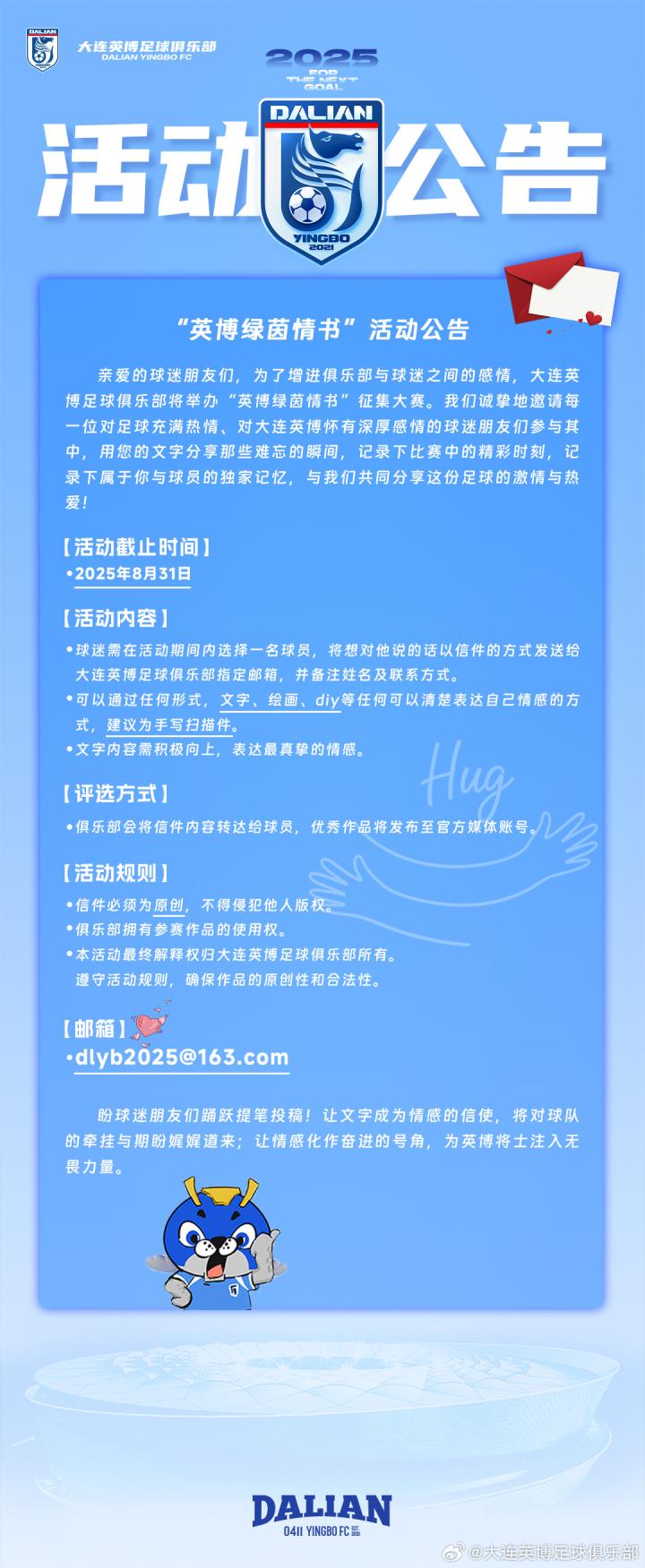 日前,中超球队大连英博宣布举办绿茵情书大赛,邀请球迷在活动期间内选择一名球员,将想对他说的话以信件的方式发送给大连英博足球俱乐部指定邮箱,俱乐部会将信件内容转达给球员,优秀作品将发布至官方媒体账号。