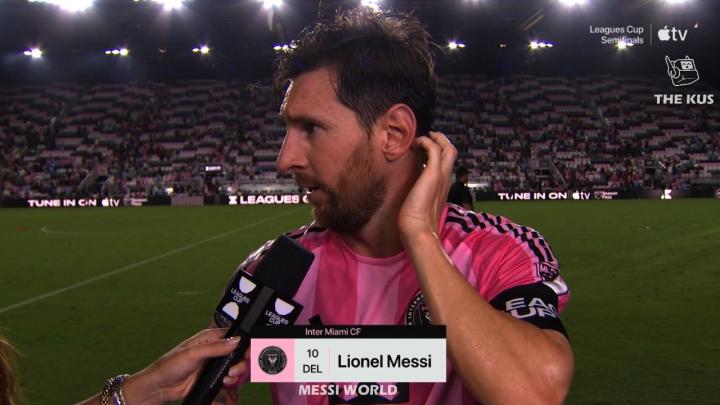 北美联赛杯半决赛迈阿密国际3-1战胜奥兰多城赛后,梅开二度的梅西接受了赛后瞬采。