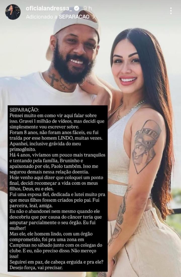 安德蕾莎-马里尼奥:“我反复思考该如何来这里讲述这些事,我录了无数个视频,最终还是决定用文字来阐述。我们在一起八年了,这八年过得并不容易。我被这个看似完美的男人背叛了无数次,甚至在怀着第一个孩子的时候,我还遭到了他的暴力对待。四年前,我们的生活稍微平静了一些,也试着为了家庭努力维系感情。正是对家庭的执念,让我在这段病态的关系里陷了太久。今天,我要在这里宣布,我已经为这段关系画上了句号,我决定带着孩子们重新开始自己的生活。从此,只有上帝、我和孩子们。”
