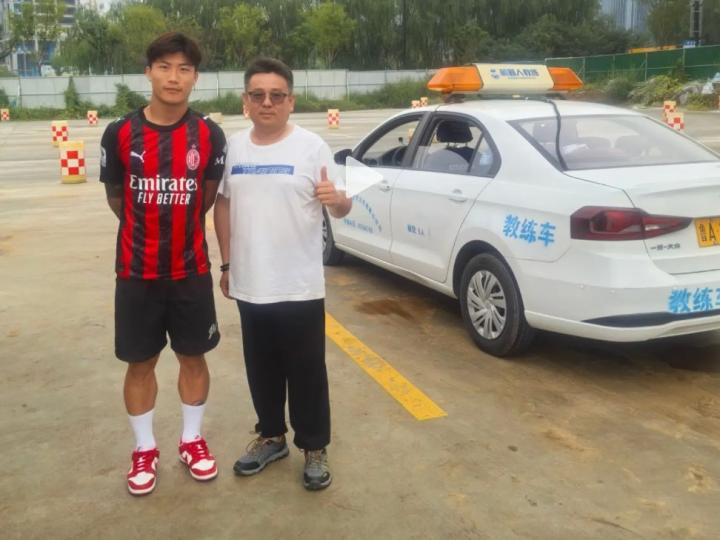 北京时间8月29日,据济南联众舜通驾校杨教练分享的照片显示,山东泰山球员谢文能身穿着米兰最新款的球衣在驾校学车。