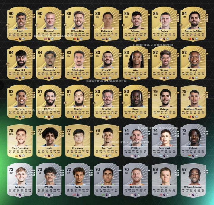 曼城的《FC26》球员能力值已被曝光,其中,罗德里&哈兰德90、赖因德斯86、谢尔基81。