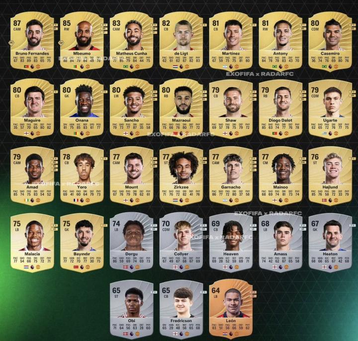 曼联球员在《FC26》中的能力值已经曝光,其中,B费87领衔、姆伯莫85、库尼亚83、安东尼81。
