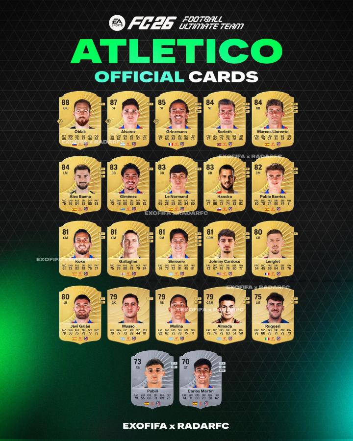 马德里竞技球员们在《FC26》中的评分已经被曝光:奥布拉克88、胡利安-阿尔瓦雷斯87、格列兹曼85、瑟洛特84。