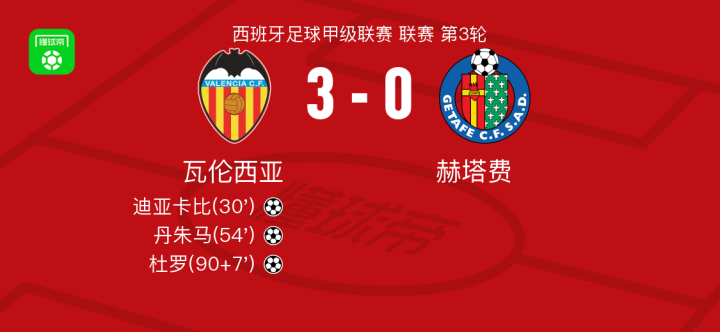 瓦伦西亚3-0大胜赫塔费,杜罗建功,丹朱马破门