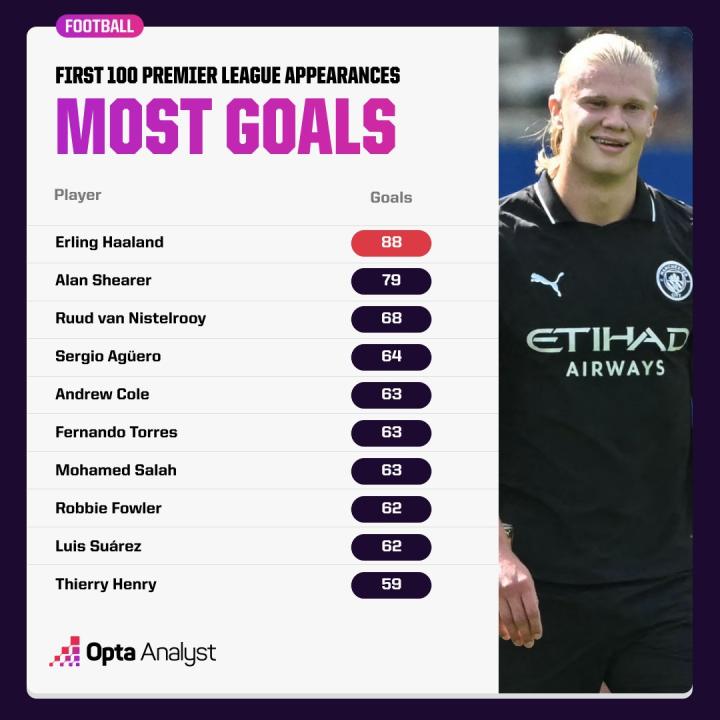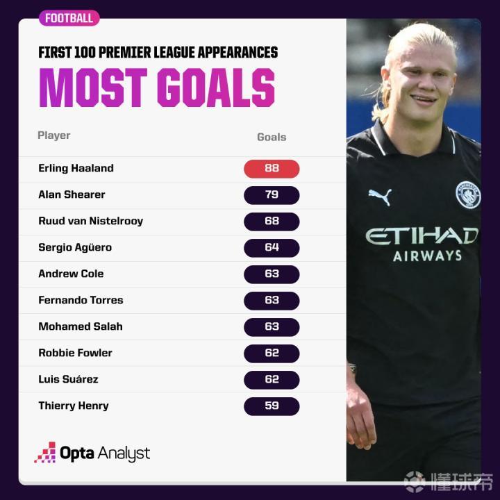 在与布莱顿的英超第3轮比赛中,曼城前锋哈兰德打入一球,至此,哈兰德英超生涯前100场比赛打入88球,是英超历史前100场进球最多的球员。
