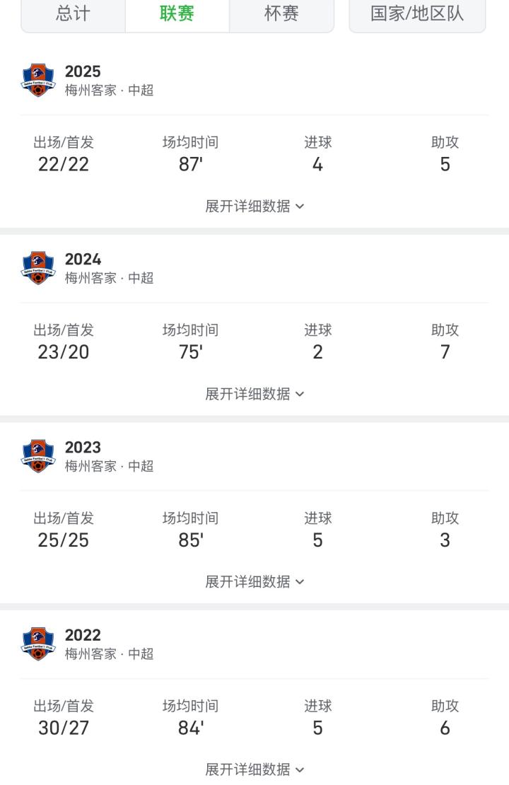 2025赛季至今,罗德里格-恩里克代表梅州客家出战22场中超联赛,贡献4粒进球和5次助攻。