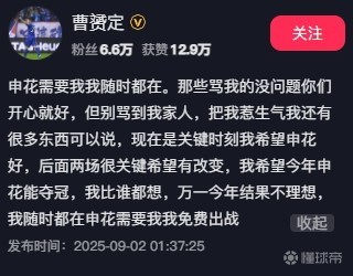 9月1日晚,原上海申花球员曹赟定在直播时的一些言论引发了外界的关注和热议。直播结束后,针对各种舆论声,曹赟定也通过社交媒体进行了回应。