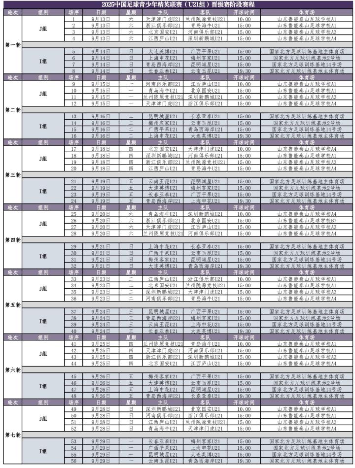 中足联官方公布了U21联赛晋级赛阶段赛程,比赛将于9月13日至9月29日期间在潍坊和呼和浩特两个赛区进行。