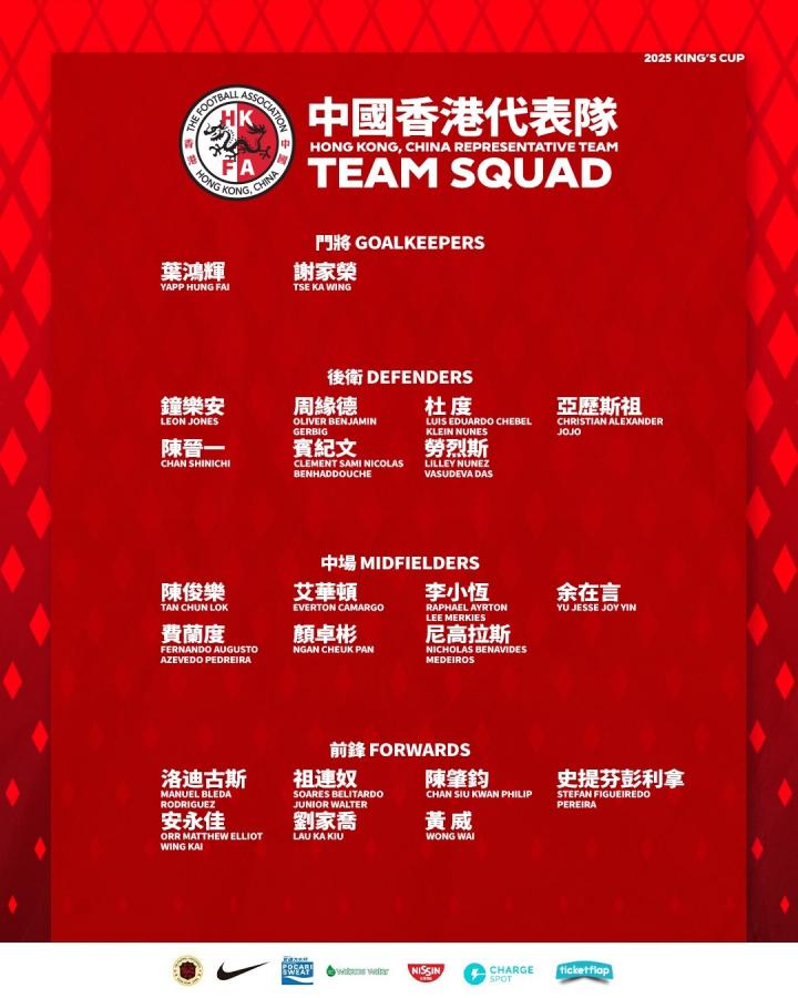 中国香港足总公布了中国香港代表队参加泰王杯(对手伊拉克、泰国/斐济)的大名单,其中陈晋一领衔,中超、中甲8人入选。
