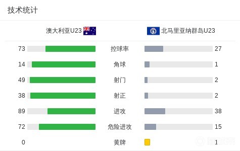 本场比赛,澳大利亚全场控球率为73%,共射门49次射正38次,获得14个角球,最终14-0大获全胜。