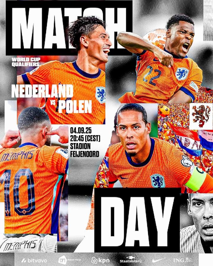 赛前,荷兰国家队发布预热海报,范戴克、德佩、赖因德斯、邓弗里斯出镜。荷兰队社媒配文称:鹿特丹·橙衣军团·比赛日。