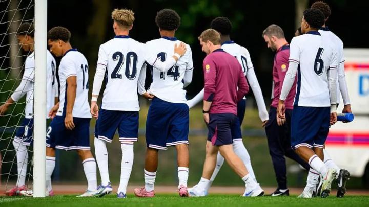 在德国杜伊斯堡进行的比赛中,球员们在下半场离开球场,同时裁判处理相关事件。目前尚不清楚辱骂来源或针对对象。英格兰U17队教练利亚姆-布兰利在球员离场时安慰他们。