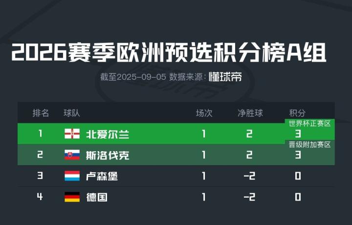 斯洛伐克则是在主场2-0击败德国排在A组第二,卢森堡输给北爱尔兰之后排名第三。