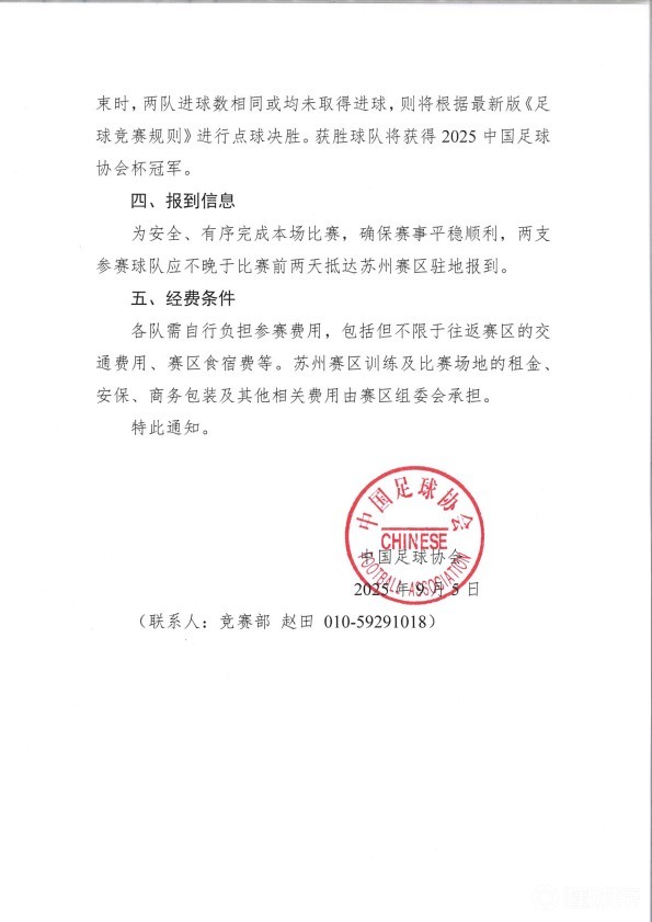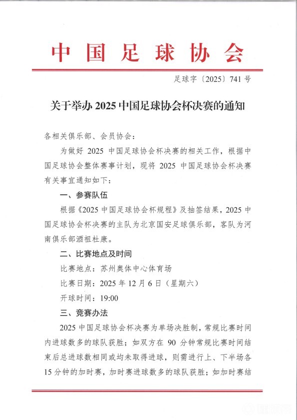 9月5日,中国足协杯官方消息,本年度的足协杯决赛定在12月6日晚进行。