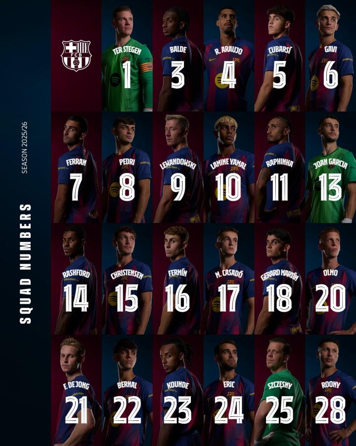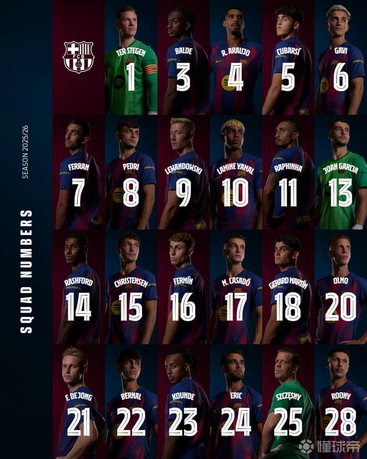 巴萨官方公布了新赛季的球衣号码,其中,特尔施特根1号,亚马尔10号,巴尔德吉28号。