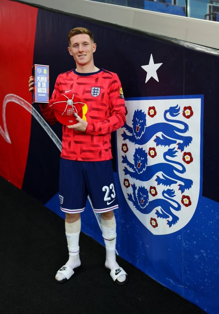 最终经过球迷投票,埃利奥特-安德森当选英格兰队内全场最佳球员,此外,他还领取了印有“1294”字样的纪念帽子。