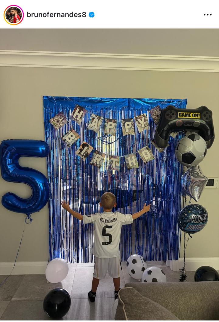 北京时间9月7日,曼联球员布鲁诺-费尔南德斯社媒为儿子庆祝5岁生日,在他发布的社媒照片中他的儿子身穿着贝林厄姆球衣。