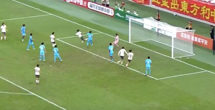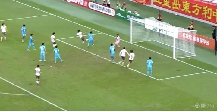 在昨晚的比赛下半场,王钰栋在左路的一次进攻,他踢出的球似传似射,门前,中国队球员两点包抄,前点的向余望碰到了皮球,球弹入了后点。