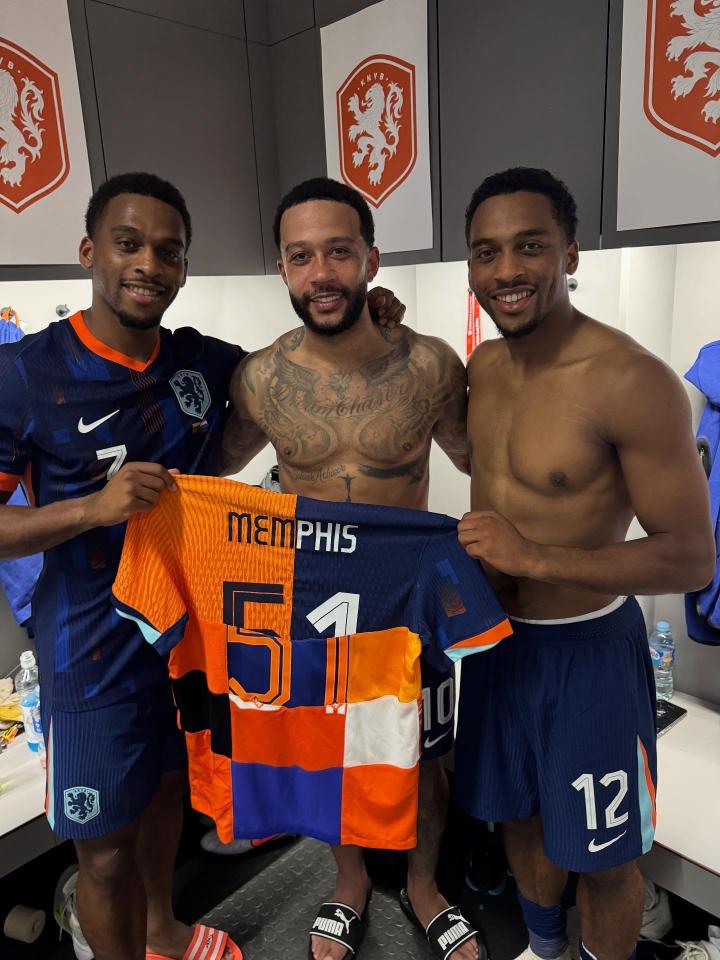 9月8日,阿森纳后卫廷贝尔在社交媒体晒出他和双胞胎兄弟昆滕-廷贝尔向荷兰队史射手王德佩赠送一件特制球衣的照片。