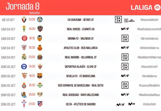 西甲官方公布了西甲第8轮比赛开球时间,其中巴萨比赛将于北京时间22:15开球,皇马、马竞的比赛将于北京时间凌晨3点开打。