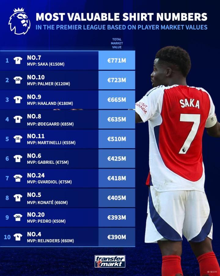 德国转会市场网站列出了英超球衣号码身价排行,7号球员以总身价7.71亿欧居首,10号球员以7.23亿欧排名第二。