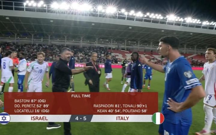 而在赛后的一段转播画面显示,意大利国家队主帅加图索在赛后与以色列球员图尔格曼疑似爆发了激烈的争吵。