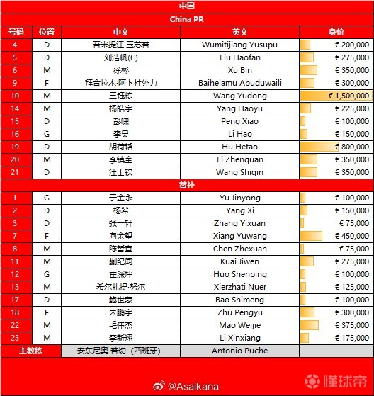 双方首发身价:中国队460万欧元,澳大利亚队382.5万欧元