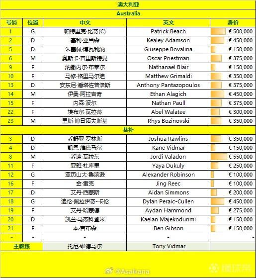 澳大利亚U23首发:1-帕特里克-比奇、13-潘塔佐普洛斯、2-基利-亚当森、5-博瓦利纳、15-内森-波尔、23-博齐诺夫斯基、6-奥斯卡-普里斯特曼、14-阿拉吉奇、22-埃布尔-瓦拉泰、9-布莱尔、10-马修-格里马尔迪