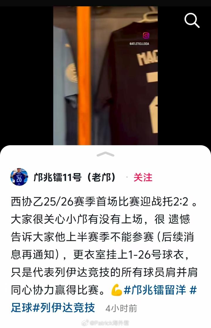 邝兆镭父亲写道:“西协乙(西班牙第四级别联赛)25/26赛季首场比赛迎战托2:2。大家很关心小邝有没有上场,很遗憾告诉大家他上半赛季不能参赛(后续消息再通知),更衣室挂上1-26号球衣,只是代表列伊达竞技(莱里达竞技)的所有球员肩并肩同心协力赢得比赛。”