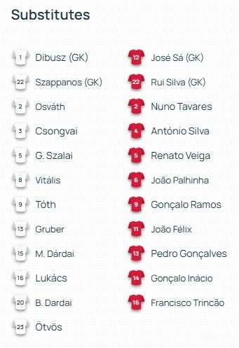 替补:1-迪布什、2-欧什瓦特、3-琼戈沃伊、5-加博尔-绍洛伊、8-维塔利什、9-托特、13-格鲁贝尔、15-达尔道伊、16-卢卡奇、20-本采-达尔道伊、22-绍保诺什、23-厄特韦斯