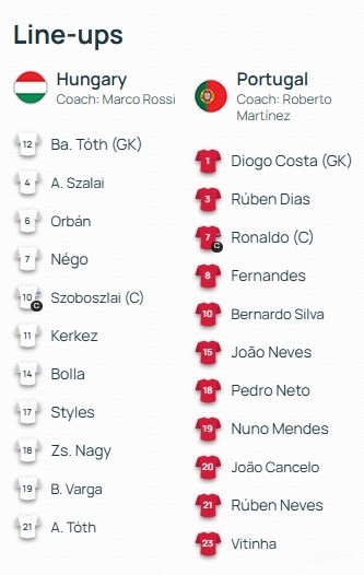 北京时间9月10日02:45,欧洲预选赛小组赛的一场较量。匈牙利坐镇主场,迎战葡萄牙。赛前,双方的阵容公布如下: