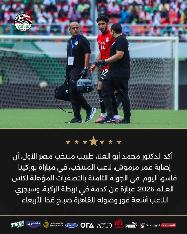 埃及国家队队医穆罕默德-阿布-埃尔-埃拉确认,马尔穆什在今天对阵布基纳法索的2026年世界杯预选赛第八轮比赛中膝盖韧带挫伤。球员将在周三上午抵达开罗后接受检查。(公告完)