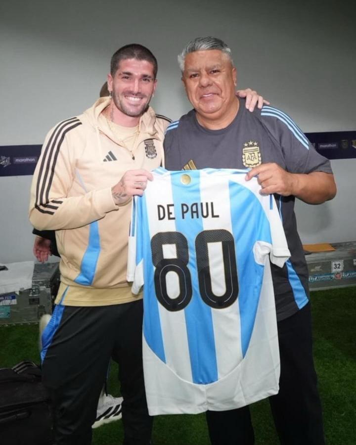 阿根廷足协主席塔皮亚在社交媒体晒出他和德保罗举着印有“80”和球员名字球衣的照片,并写道:“祝贺你身披这件最美球衣出战80场比赛。继续用那份属于你的拼劲和态度来捍卫它吧。