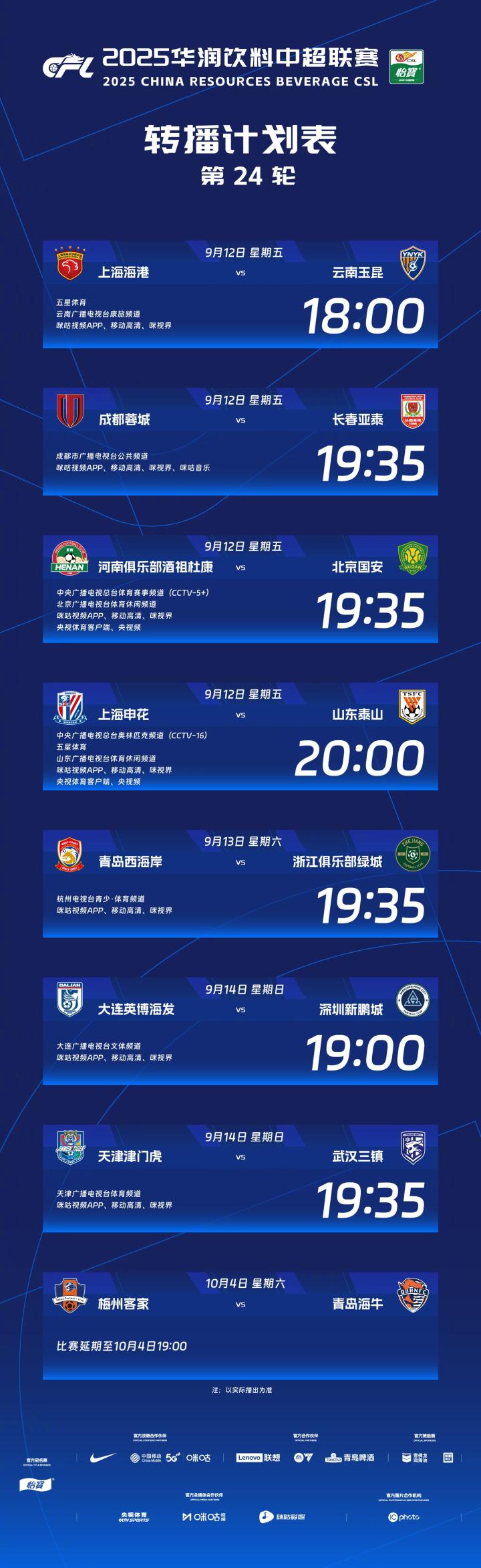 北京时间9月11日,中超官方发布联赛第24轮(部分场次)转播计划表,CCTV16转播上海申花vs山东泰山,CCTV5+转播河南vs北京国安。