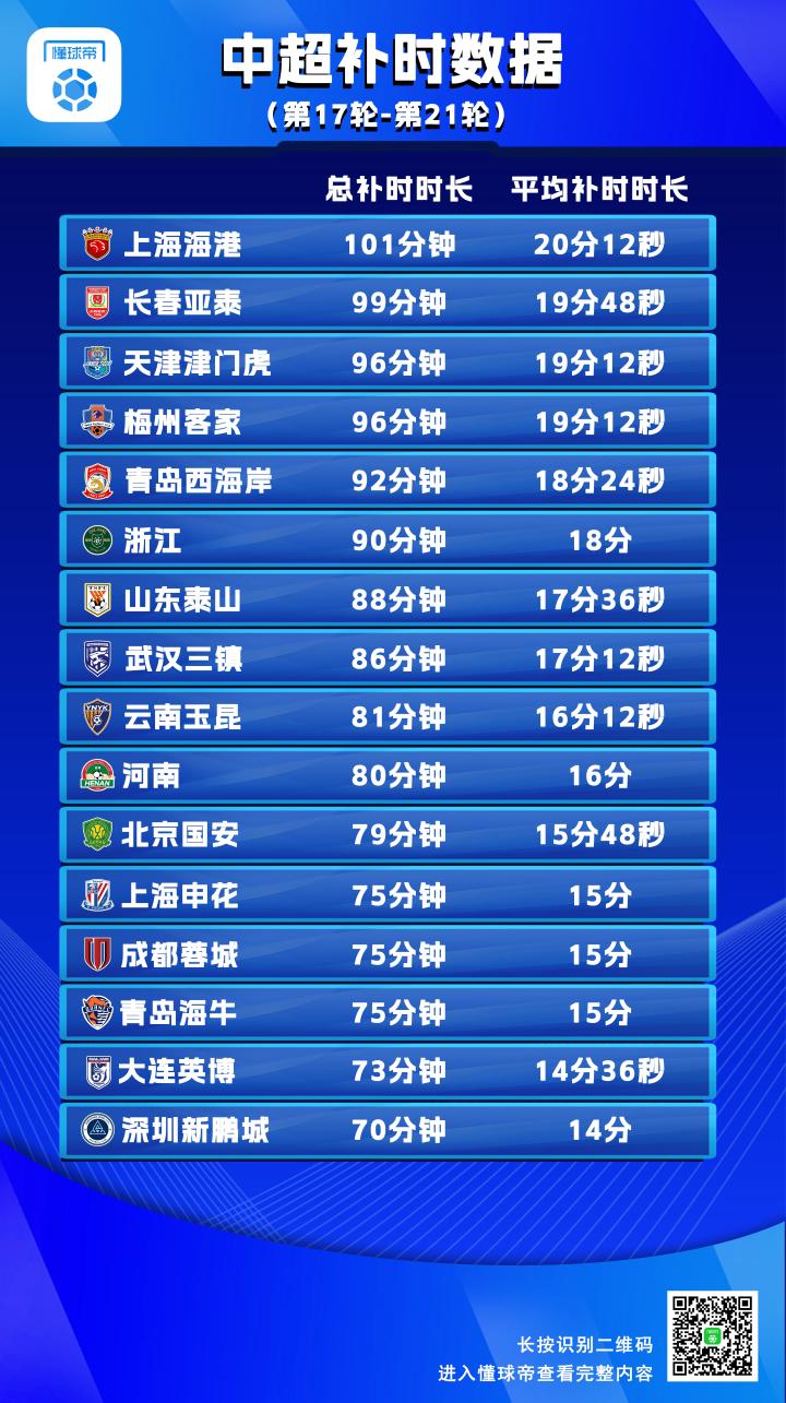 整体来看,中超16支球队在第17-21轮中,都经历了总共超过70分钟的补时。其中,上海海港5轮总补时时长达到了101分钟,场均补时20分12秒,是16支中超球队中的“补时之最”。深圳新鹏城经历的总补时时长最少,但也达到了70分钟,场均14分钟。