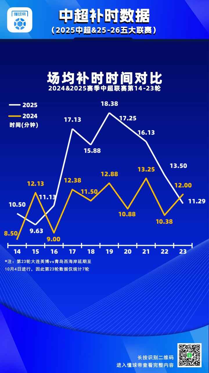 我们可以认定,2025赛季中超第17-21轮整体的补时时长要远高于2024赛季同期。