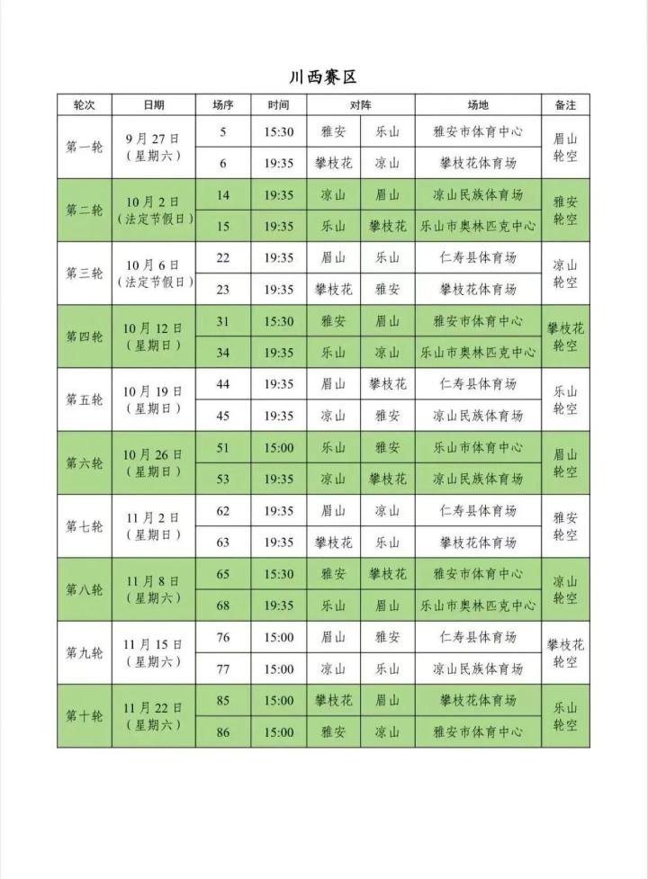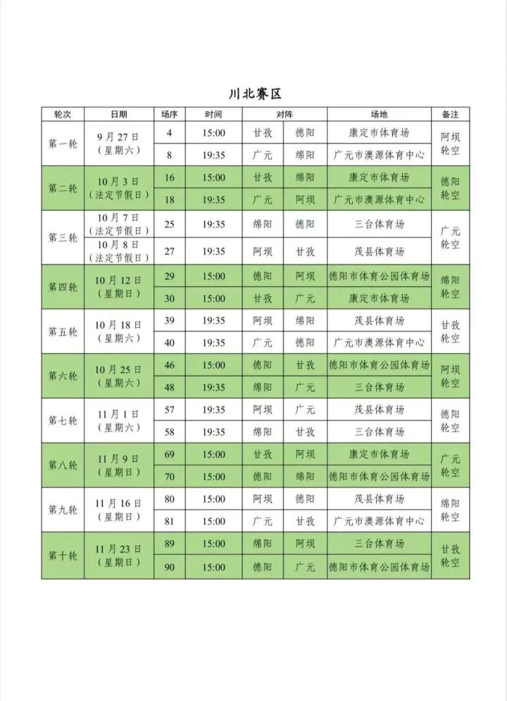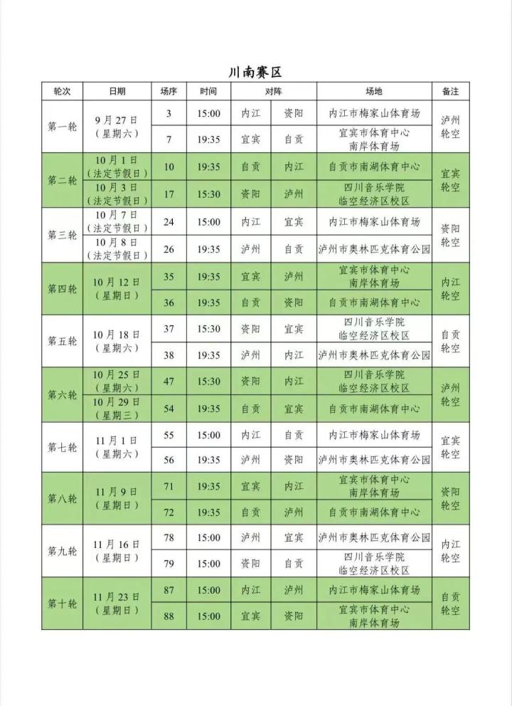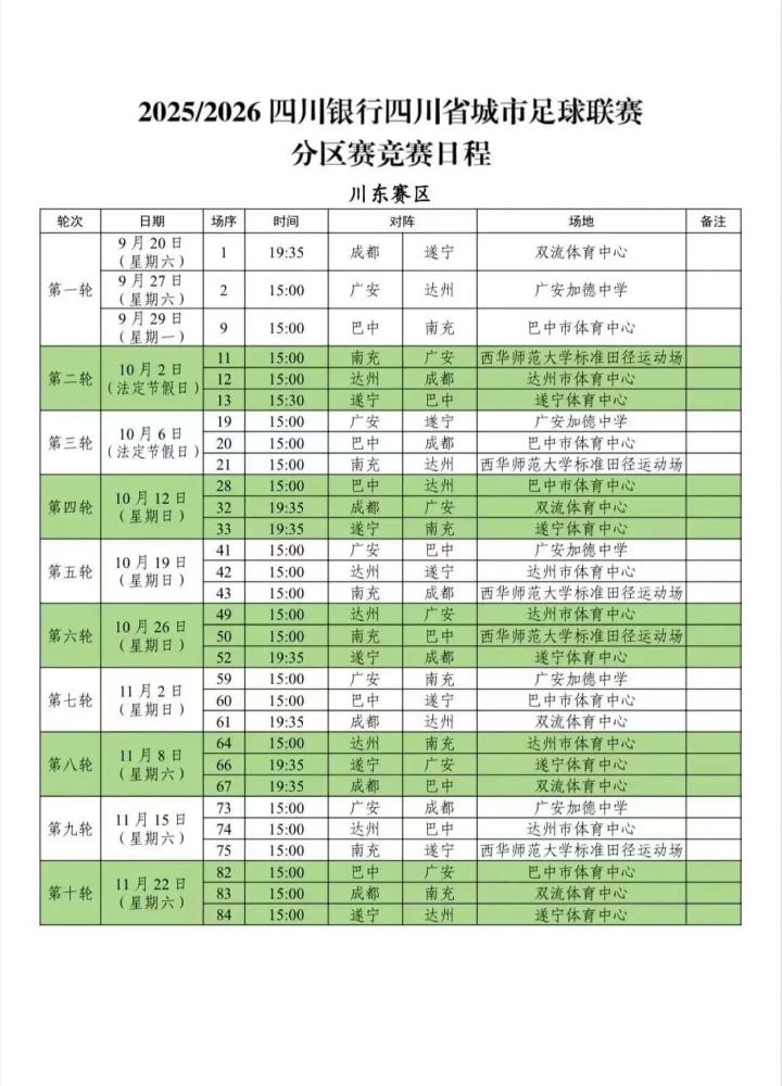 9月11日,四川省城市足球联赛(川超联赛)的分区赛赛程公布,比赛将从9月20日踢到11月底。