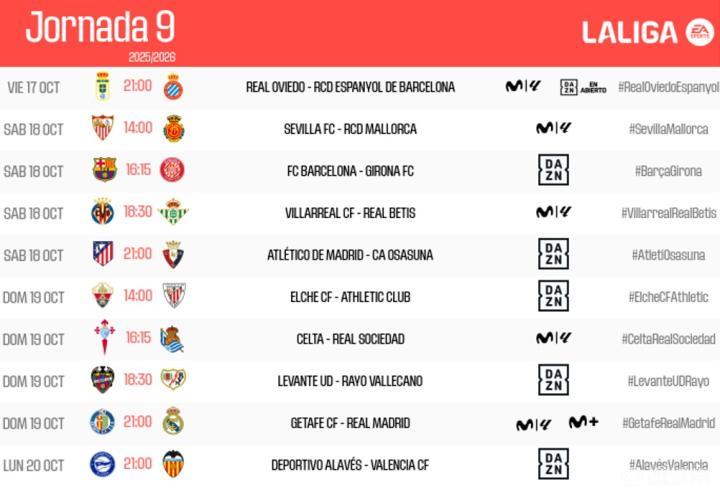 西甲官方公布了西甲第9轮比赛开球时间,巴萨的比赛将于北京时间22:15开打,马竞、皇马的比赛将于凌晨3点进行。