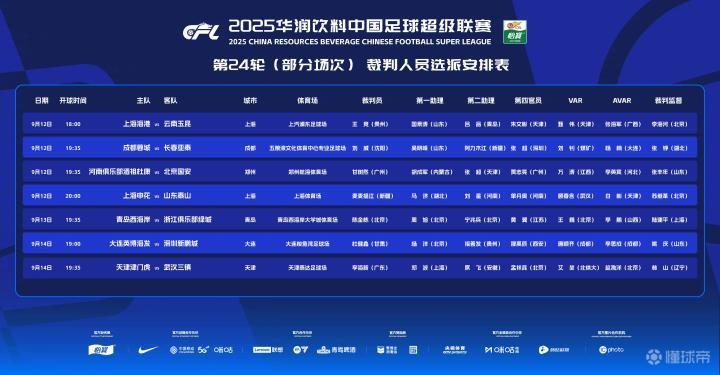 北京时间9月12日,中超第24轮(部分场次)裁判名单公布,麦麦提江执法上海申花vs山东泰山,此前被造谣的唐顺齐担任大连英博vs深圳新鹏城VAR。
