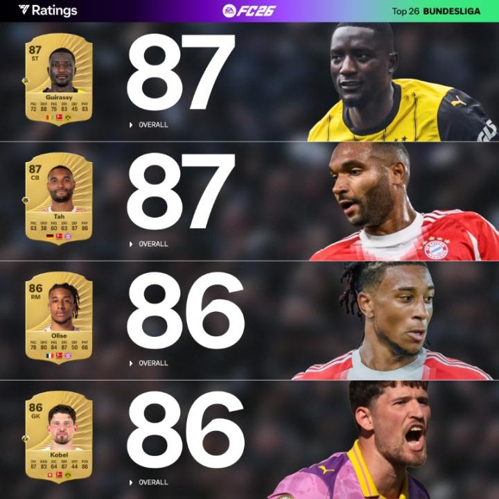 EA官方公布了《FC26》德甲前26球员,其中,基米希和凯恩以89分领衔,约纳坦-塔与吉拉西并列第三。
