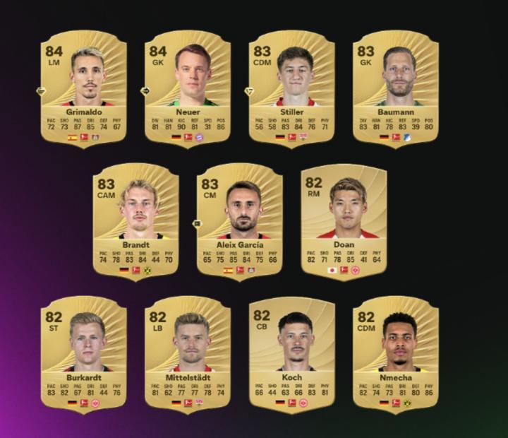 格里马尔多、诺伊尔、施蒂勒、鲍曼、布兰特、阿莱士-加西亚、堂安律、布尔卡特、米特尔施泰特、科赫、费利克斯-恩梅加。