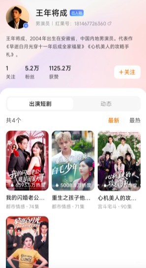 最近,王年将成作为男二号出演了《我的闪婚老公竟是闺蜜大哥》的短剧,目前在热播榜单排名前列,此外,他还主演过多部作品。