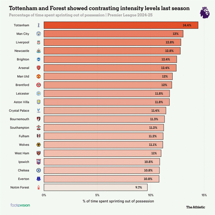 森林队能否应对这种增加的工作量还有待观察。热刺的高强度跑动源于波斯特科格鲁希望在高位逼抢并夺回球权。相比之下,森林队上赛季在逼抢方面并不积极,每进行一次防守动作平均允许对手传球15次,为联赛最高。