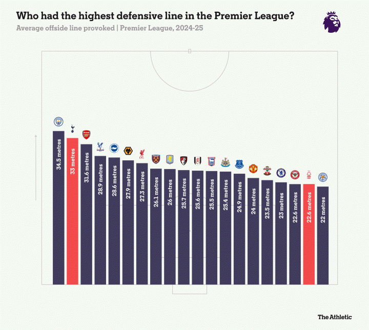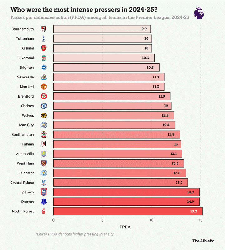“我们喜欢逼抢这一点不是秘密,而且他的职业态度非常好,”波斯特科格鲁谈到索兰克时说道,后者不知疲倦的表现也反映在数据中。2024-25赛季,没有任何球员比他完成更多“双压迫”(即在三秒内连续对两名对手施压)。波斯特科格鲁要么为移动能力较弱的伍德妥协,要么转向更有活力的选择来引领逼抢,比如新援阿尔瑙-卡利穆恩多。