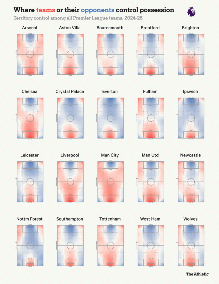 努诺以防守为基础的理念适合球队并带来了成果,但很少有球队能够持续挑战这种风格的足球。下图显示了森林上赛季在比赛中放弃了多少控球区域。